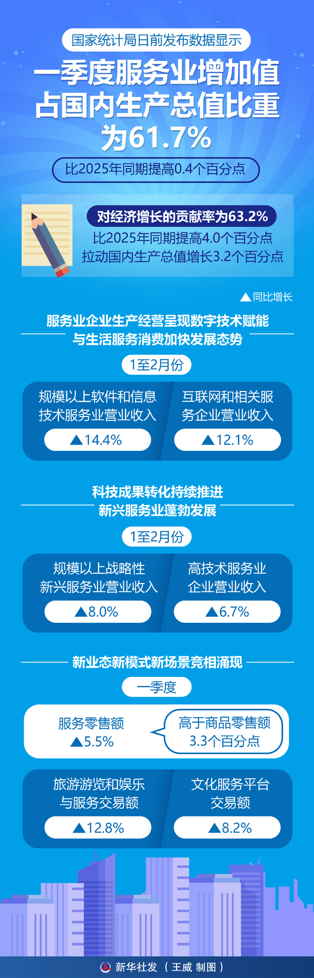 国家统计局日前发布数据显示,今年一季度,服务业增加值占国内生产总值比重为61.7%,比上年同期提高0.4个百分点;对经济增长的贡献率为63.2%,比上年同期提高4.0个百分点,拉动国内生产总值增长3.2个百分点。